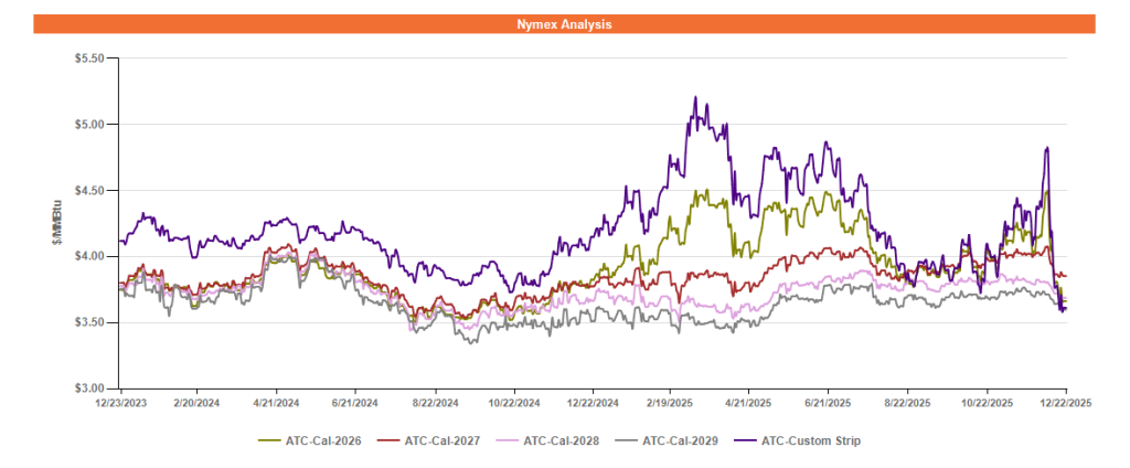 Figure 2 below shows the historical December 22, 2023 through December 22, 2025 Around the Clock (ATC) forward NYMEX natural gas prices in dollars per MMBtu for the first quarter of 2026 (labeled as “Custom Strip”) and calendar years 2026, 2027, 2028, and 2029.