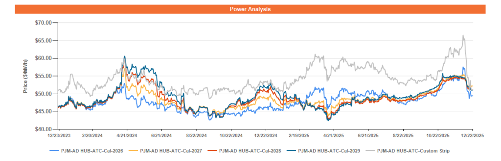 Figure 3 below shows the historical December 22, 2023 through December 22, 2025 ATC forward power prices in dollars per Megawatt hour (MWh) for the first quarter of 2026 (labeled as “Custom Strip”) and calendar years 2026, 2027, 2028, and 2029 for the AD Hub.