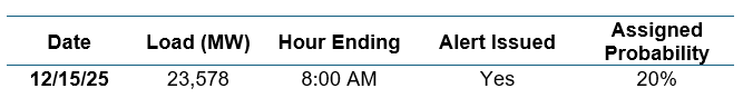 Brakey Energy provides email and text alerts in advance of loads having the potential to set the year’s American Electric Power (AEP) Zone Transmission Coincident Peak (CP, or 1CP) to clients enrolled in AEP’s Basic Transmission Cost Rider (BTCR) transmission pilot program. On December 15, 2025 an arctic blast swept across the Great Lakes, sending much of the AEP Zone into subzero temperatures with the wind chill. As a result, Brakey Energy issued a CP alert for the morning of December 15.