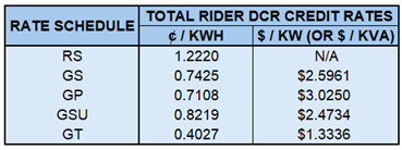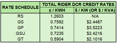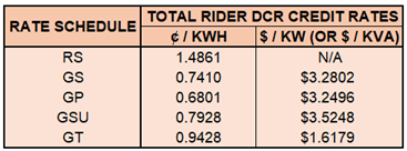 The tables below summarize the rather significant Rider DCR credits that will be returned to customers served under OE, CEI, and TE Residential (RS), Secondary (GS), Primary (GP), Subtransmission (GSU), and Transmission (GT) rate schedules. Rider DCR credits on a per kWh basis will also be issued to OE, CEI, and TE customers billed under the companies’ three lighting tariffs.