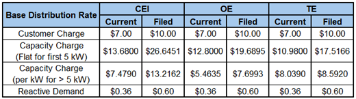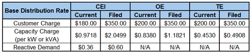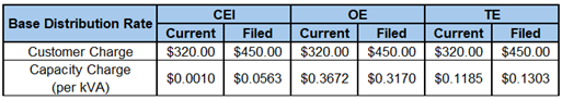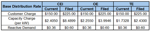 The tables below summarize the current and filed base distribution rates for FE GS, GP, GSU, and GT customers. Subject to PUCO approval, the rates summarized below would go into effect. However, if requests for rehearing should be filed by intervening parties in the case (deadline of December 19) and a rehearing is granted, we would expect the implementation of these rates to be delayed as the rehearing takes place.