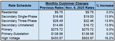 As shown in Table 1, monthly customer charges will remain unchanged for Residential, Primary, and Primary-Substation rate classes. Secondary customers now face a 13.9% increase, while High Voltage customers see a 16.2% increase to their sole base distribution charge.