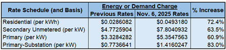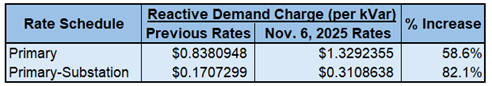 Base distribution costs for Primary and Primary-Substation customers also include reactive demand charges. Increases to these charges that became effective November 6 are shown in Table 3.