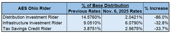 Additionally, some distribution riders decreased as a result of certain cost-recovery mechanisms being rolled into base distribution rates. Table 4 presents the previous and new rates for AES Ohio’s Distribution Investment Rider, Infrastructure Investment Rider, and Tax Savings Credit Rider, which are billed as a percentage of base distribution charges.