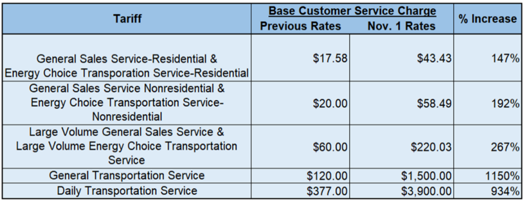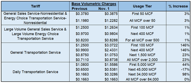 Tables 5 and 6 below summarize the changes to monthly customer charges and volumetric delivery charges by tariff class, comparing prior rates to those effective November 1.