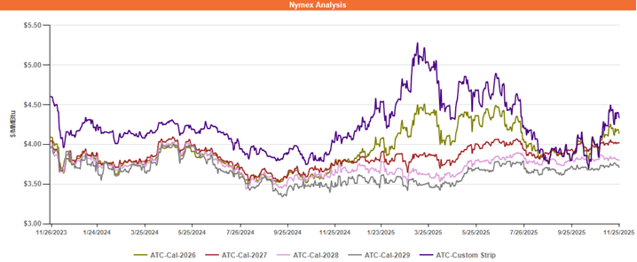 Figure 2 below shows the historical November 25, 2025 through November 25, 2025 Around the Clock (ATC) forward NYMEX natural gas prices in dollars per MMBtu for December 2025 – March 2026 (labeled as “Custom Strip”) and calendar years 2026, 2027, 2028, and 2029.