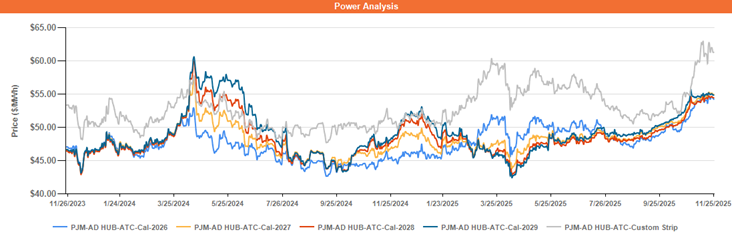 Figure 3 below shows the historical November 25, 2023 through November 25, 2025 ATC forward power prices in dollars per Megawatt hour (MWh) for December 2025 – March 2026 (labeled as “Custom Strip”) and calendar years 2026, 2027, 2028, and 2029 for the AD Hub.
